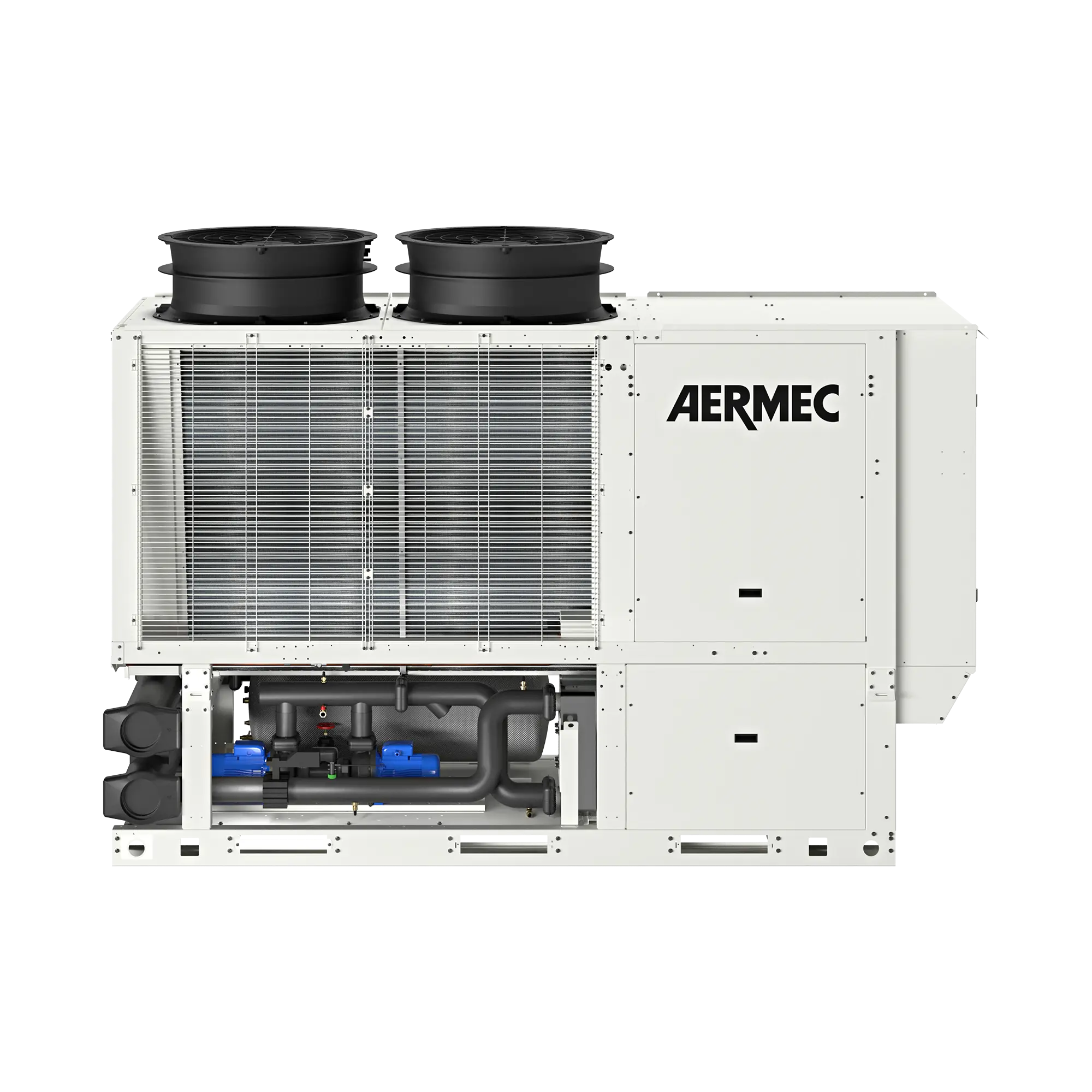 Outdoor reversible heat pump for the production of chilled and heated water. PRM uses the natural refrigerant R290 with a GWP of only 3. Its modular architecture, up to 9 units that can be coupled, together with the system with 4 scroll compressors on two circuits, makes the system more reliable and guarantees continuity of operation. Designed to meet the air conditioning needs of residential, commercial or industrial complexes, it operates at full load up to -20 °C of external air temperature in the winter season, up to 48 °C in the summer season and produces hot water up to 75 °C. It is available in high efficiency and high efficiency silenced versions.