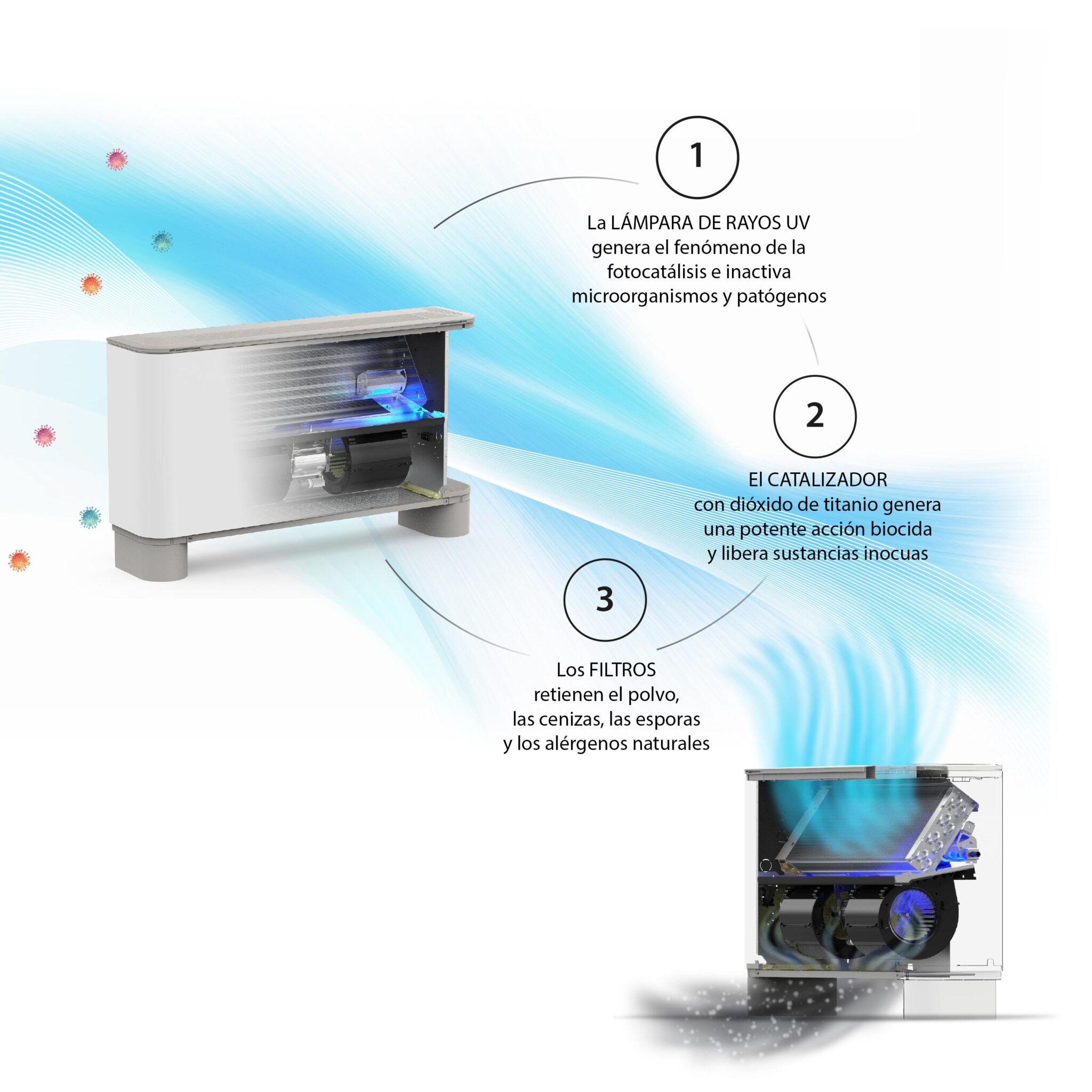 El dispositivo fotocatalítico, a través de la luz emitida por la lámpara, genera el fenómeno de la fotocatálisis, creando y liberando especies altamente reactivas y oxidantes (H2O2 y OH–) que atacan a los contaminantes (gérmenes, bacterias y virus) degradándolos y eliminándolos. La lámpara de rayos UV (longitud de onda de 220-300 nm) irradia sobre una superficie de dióxido de titanio (TiO2): esta sinergia provoca una fuerte ionización de la humedad contenida en el aire y la consiguiente formación de moléculas de H2O2 que atacan a los microorganismos y los inactivan, destruyendo su ADN y descomponiendo otras moléculas nocivas.