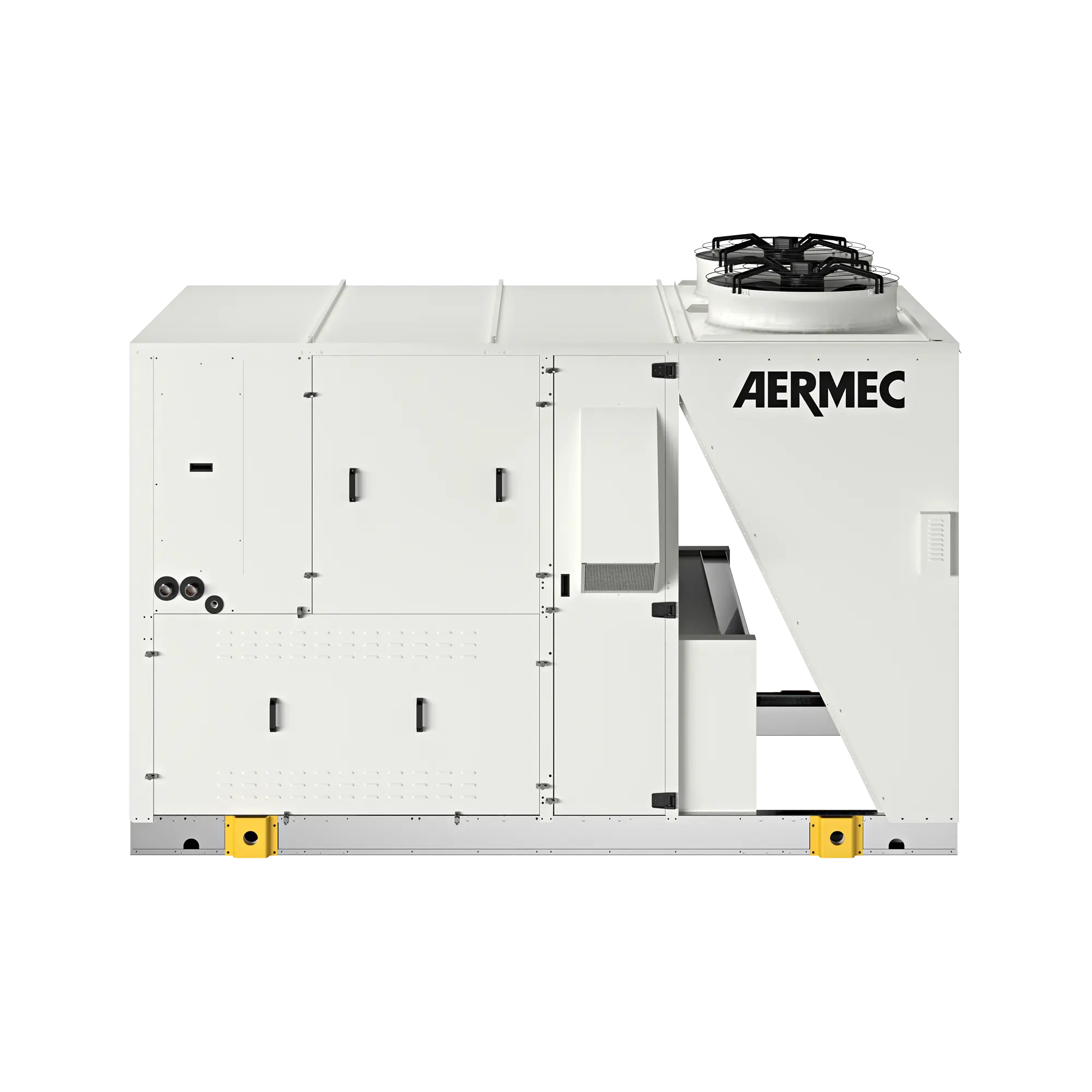 Climatiseur autonome condensé à air Roof-Top avec structure en tôle galvanisée peinte aux poudres, panneaux de 50 mm isolés au polyuréthane. Configuration recirculation seule, recirculation+renouvellement jusqu'à 30%, recirculation+renouvellement+expulsion et récupération thermodynamique, free-cooling total/partiel. Circuit frigorifique avec compresseur scroll, batteries d'échange thermique standard Cu-Al et Cu-Al pré-peint ou Cu-Cu Sn sur demande. Ventilateurs côté intérieur plug-fan standard ou hauteur manométrique élevée, avec moteur EC et pressostat différentiel d'alarme. Ventilateurs axiaux AC sur le côté extérieur, avec moteur EC et dispositif de réglage du régime pressostatique en option. Filtres G4 de série sur le refoulement et la reprise, le cas échéant ; sur demande, filtres F7 ou électrostatiques H10 uniquement sur le refoulement. Contrôleur électronique. Accessoires : sondes CO2 et/ou COV, batteries de chauffage à eau et électriques, module brûleur à gaz, contrôle humidification et déshumidification etc.